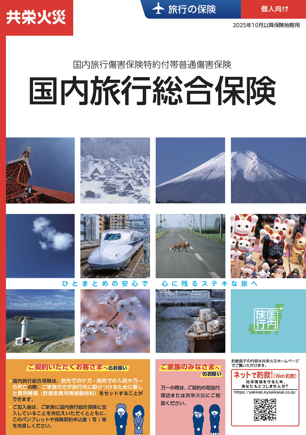 楽しい旅行をバックアップする国内旅行総合保険。ケガの補償を含めて4つの補償をご用意しました。旅行中のもしもに備える心強い味方です。